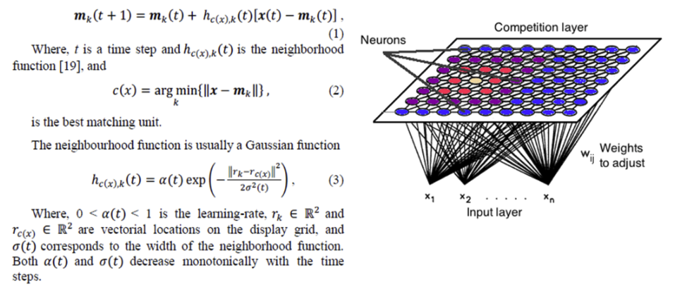 The core functionality of the SOM algorithm is dimensional reduction: it projects high-dimensional input data (with many attributes or features) onto a low-dimensional space, typically a two-dimensional map, while preserving topological order. This preservation means that related data points are placed close to one another on the resulting map.