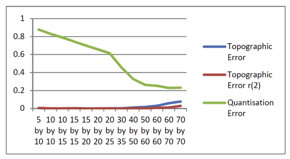 Topological Error: This measures the proportion of input samples in which the first- and second-best matching units are not neighbours on the map. A low error suggests that topologically close items on the map are genuinely similar in the source data.