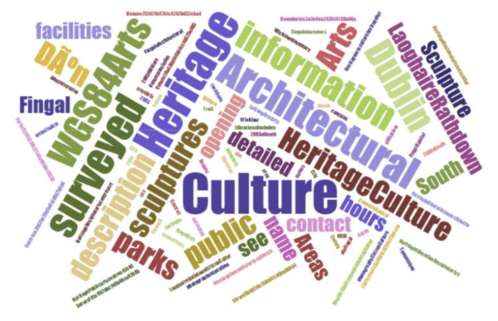 Further analysis using Word Clouds based on the metadata and node features helped visualise the concepts captured by clusters of datasets. For example, one node might clearly display keywords such as Culture, Heritage, and Arts, confirming that the topic is being grouped.